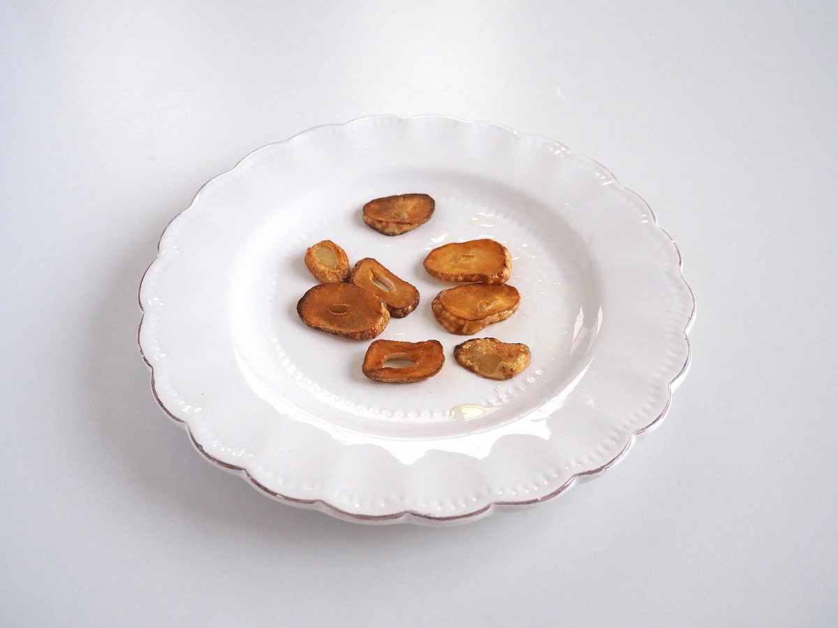 2. フライパンに油(分量外)と輪切りにんにくを加えて中火にかける。全体がこんがりきつね色になるまで加熱し、一旦お皿に取り出す(にんにくチップ)。