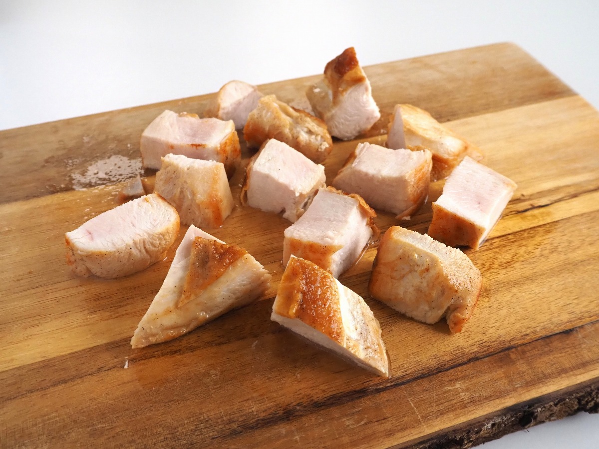3. 同じフライパンに鶏むね肉を皮目から加える。中火で焼き、こんがり焼き目がついたらひっくり返す。(油が残っていれば拭き取ってから)水大さじ2(分量外)を加えて蓋をし、中弱火で5分蒸し焼きにする。蓋を取り、トングで鶏肉を挟みながら全体に焼き目をつける。アルミホイルに包み、そのまま10分置く。サイコロ状に切り分ける。
