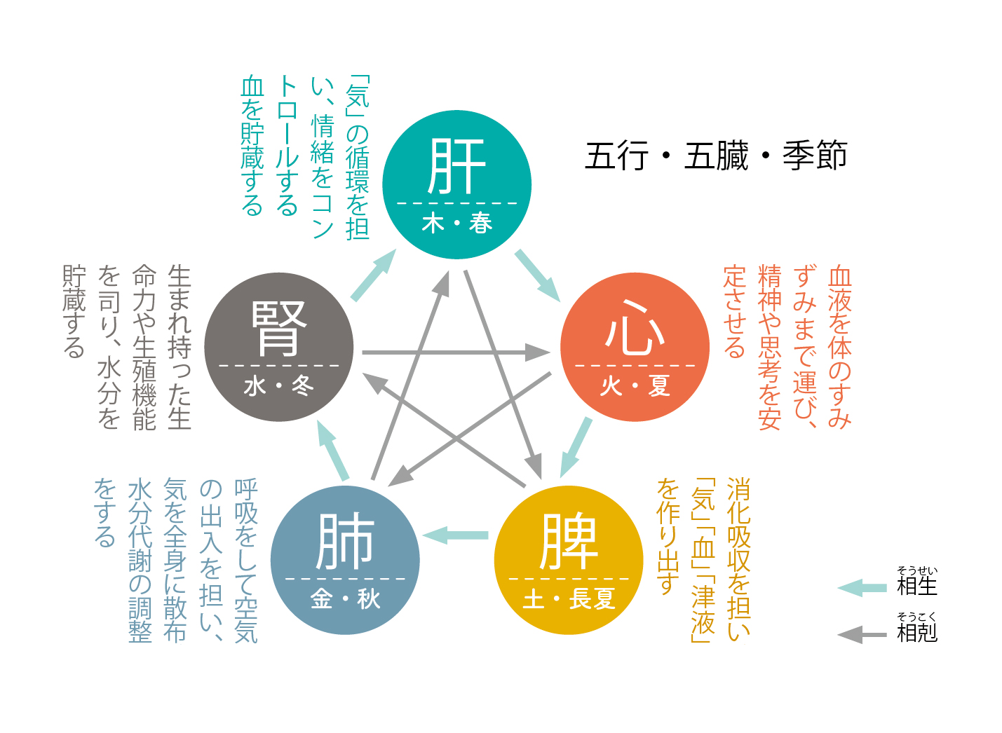 中医学の基本的な理論は、陰陽五行説に基づいて、木火土金水という自然界の特性に合わせた季節(四季+雨季)や人体の「五臓」が割り振られています。これらは独立した存在ではなく、互いに影響を及ぼし合っており、その関係性が示されているのが、下記の図です。