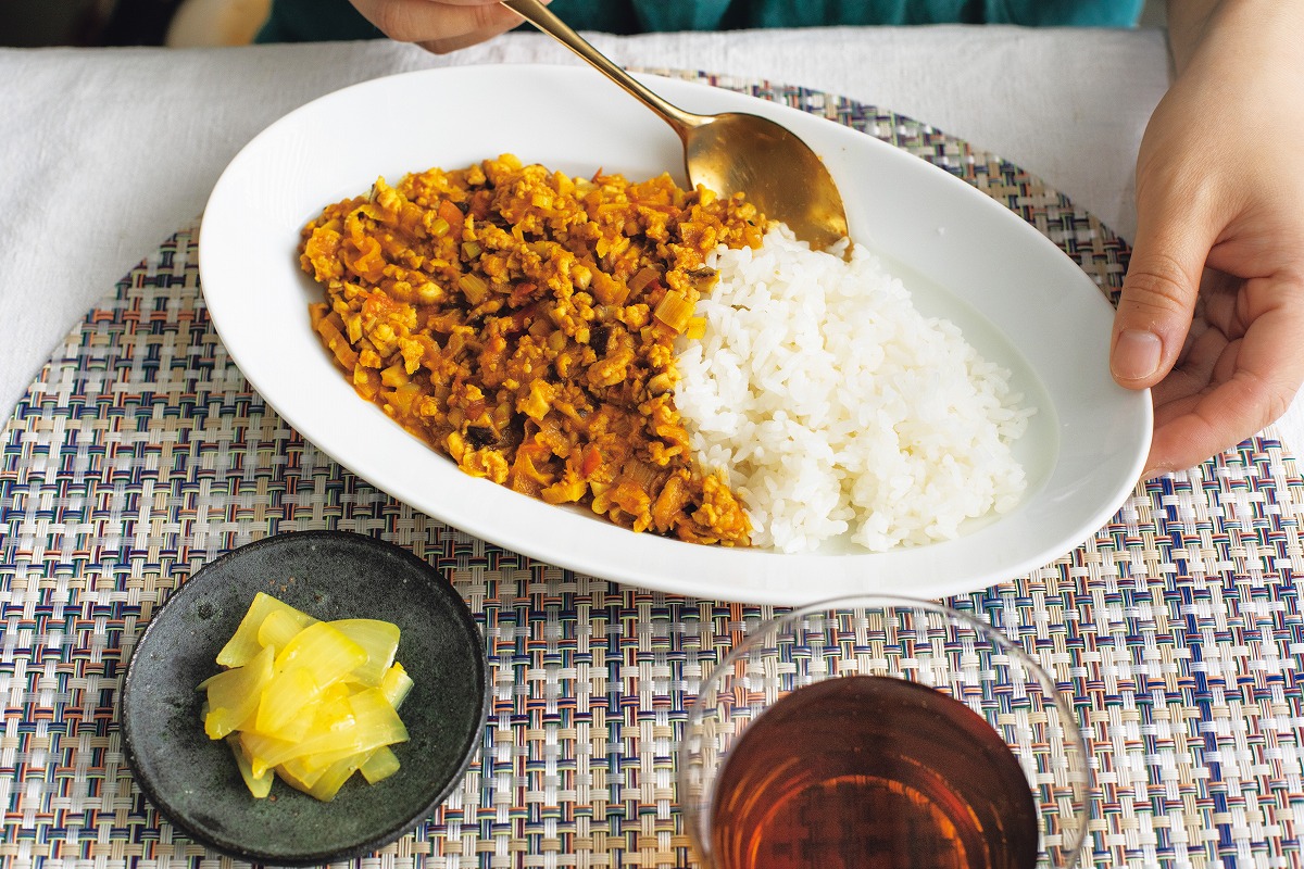 「キーマカレーには、薬膳でいうところの“温熱性”の食材をたっぷりと詰め込みました。鶏肉、長ねぎ、しょうが、カレー粉がそれにあたり、冷え対策に役立ちます。和食っぽいエッセンスを入れたくて長ねぎやしいたけを使っていますが、玉ねぎやほかのきのこで代用してもらってもOKです。また、鶏ももひき肉ではなく、鶏むねひき肉を使っていただいても効能は変わりません。豚ひき肉や合いびき肉だと効能は変わってきますが、おいしく作れると思います。作り置きや冷凍にも向いていますし、汁けがないのでお弁当にもおすすめ。気が向いたときや材料があるときに作ってみてください」