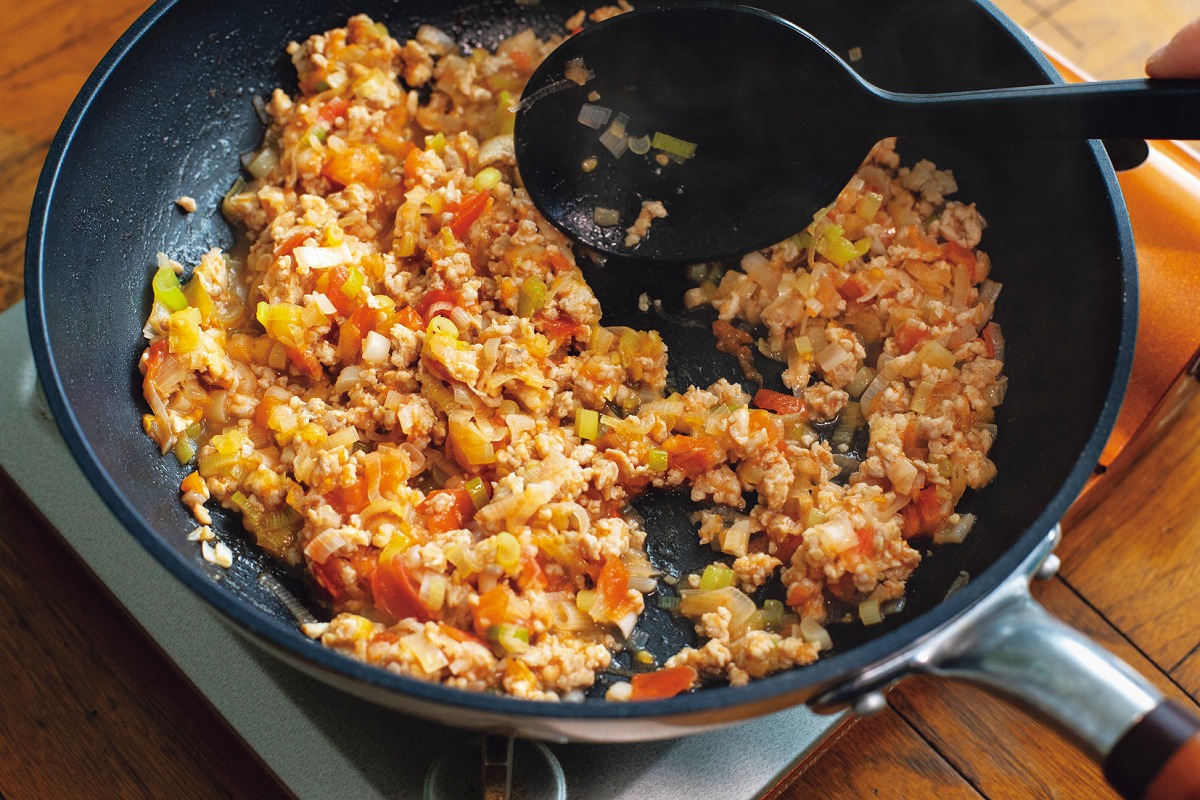 2. フライパンにサラダ油、1のしょうがを中火で熱し、香りが出たら長ねぎ、トマトを加えて炒める。トマトが崩れて水っぽさがなくなってきたら、ひき肉を加えて炒め、ひき肉の色が変わったらしいたけを加えてしんなりするまで炒める。