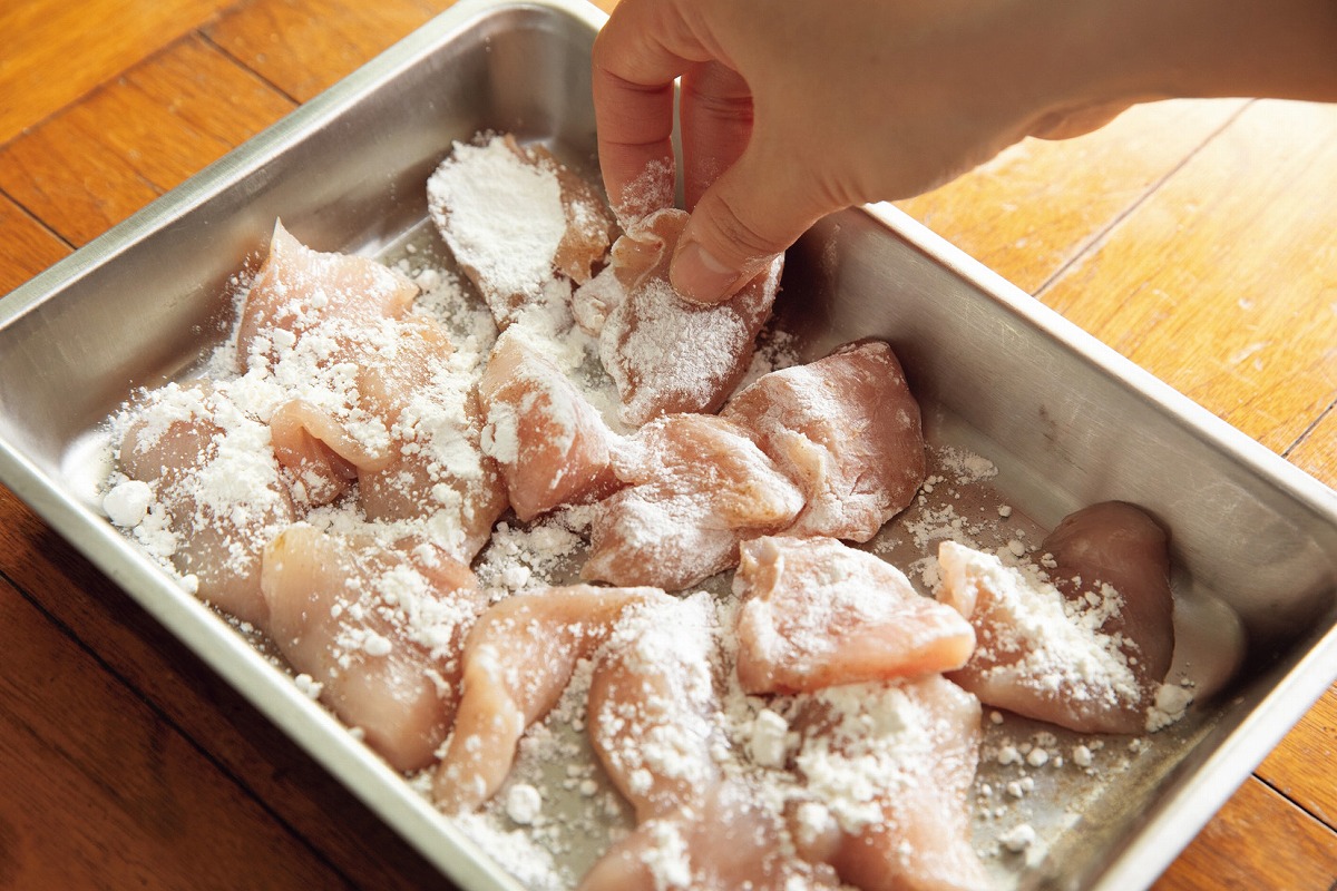 鶏肉の全体に薄力粉をまぶしておくと、加熱してもパサパサにならず、ほどよいとろみもついておいしさもアップ。