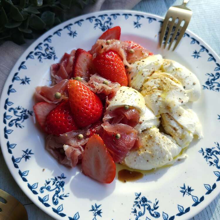 いちごとチーズ、生ハムを組み合わせた苺のカプレーゼは、準備から盛り付けまであっという間。甘みのあるいちごに、モッツァレラのやさしいコクと生ハムの塩気が重なります。