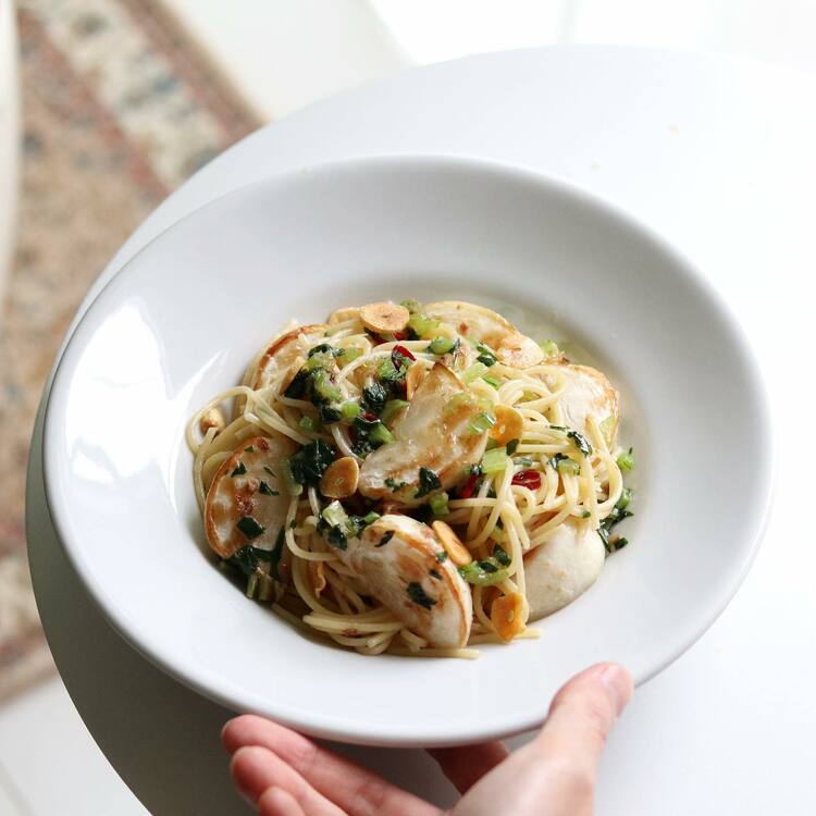 仕上げに鰹節を加えると、やさしい旨みが全体を包み込み、いつものペペロンチーノがほっとする味わいに変わります。