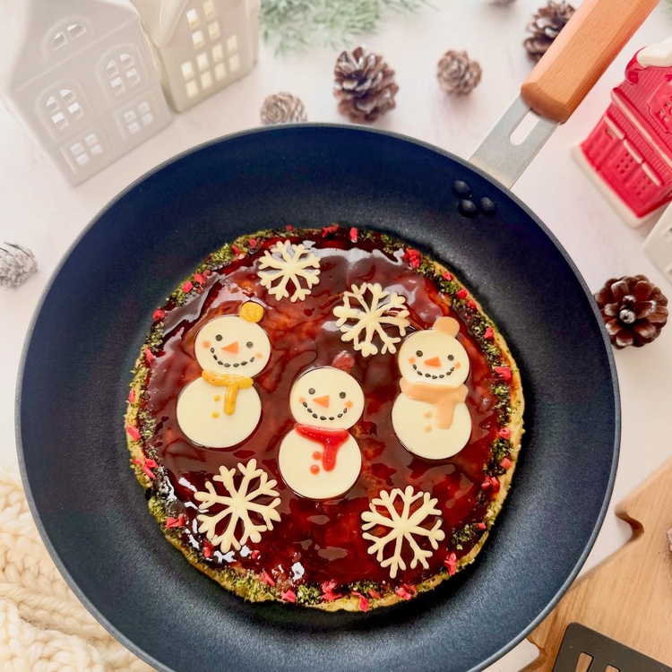 こちらは、かわいいスノーマンを登場させて、いつもの食卓を一気に冬のアートに変えてしまう「お好み焼き」!
