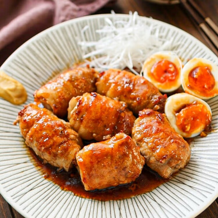 ポイントは豚バラ薄切り肉を使うこと。3枚ずつ重ねて手前からきつめに巻いたら、フライパンで焼いていきます。甘辛いタレを回し入れたら、数分だけ煮込めば完成です。