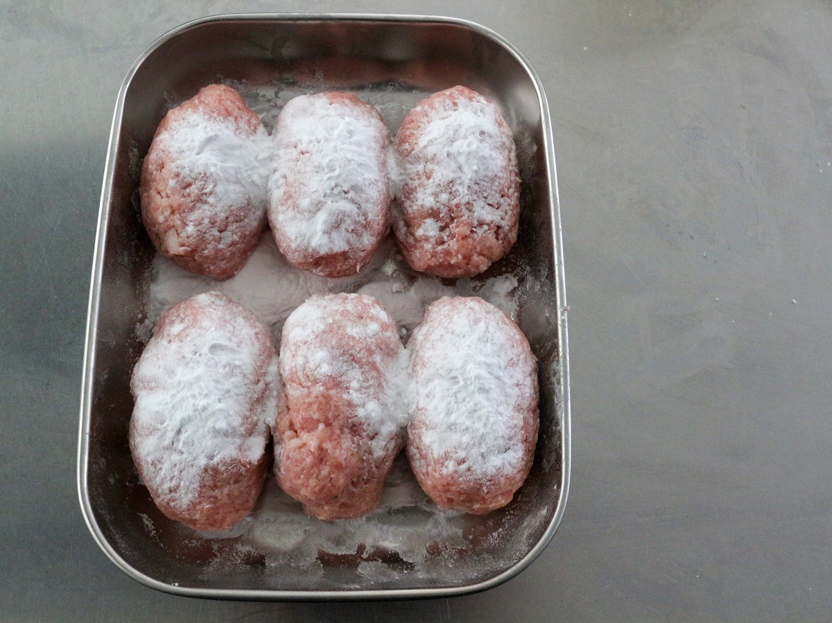2. 6等分した1を小判型に成形し、両面に片栗粉をはたく。