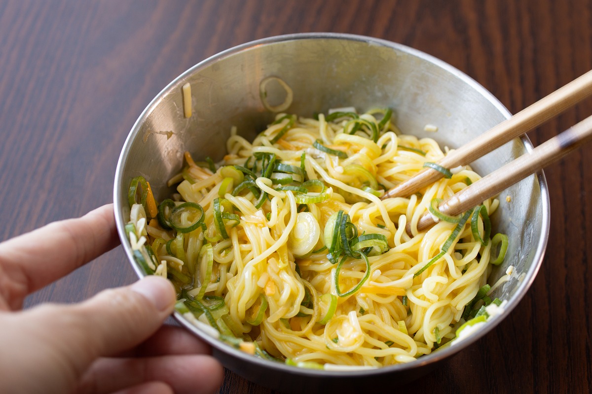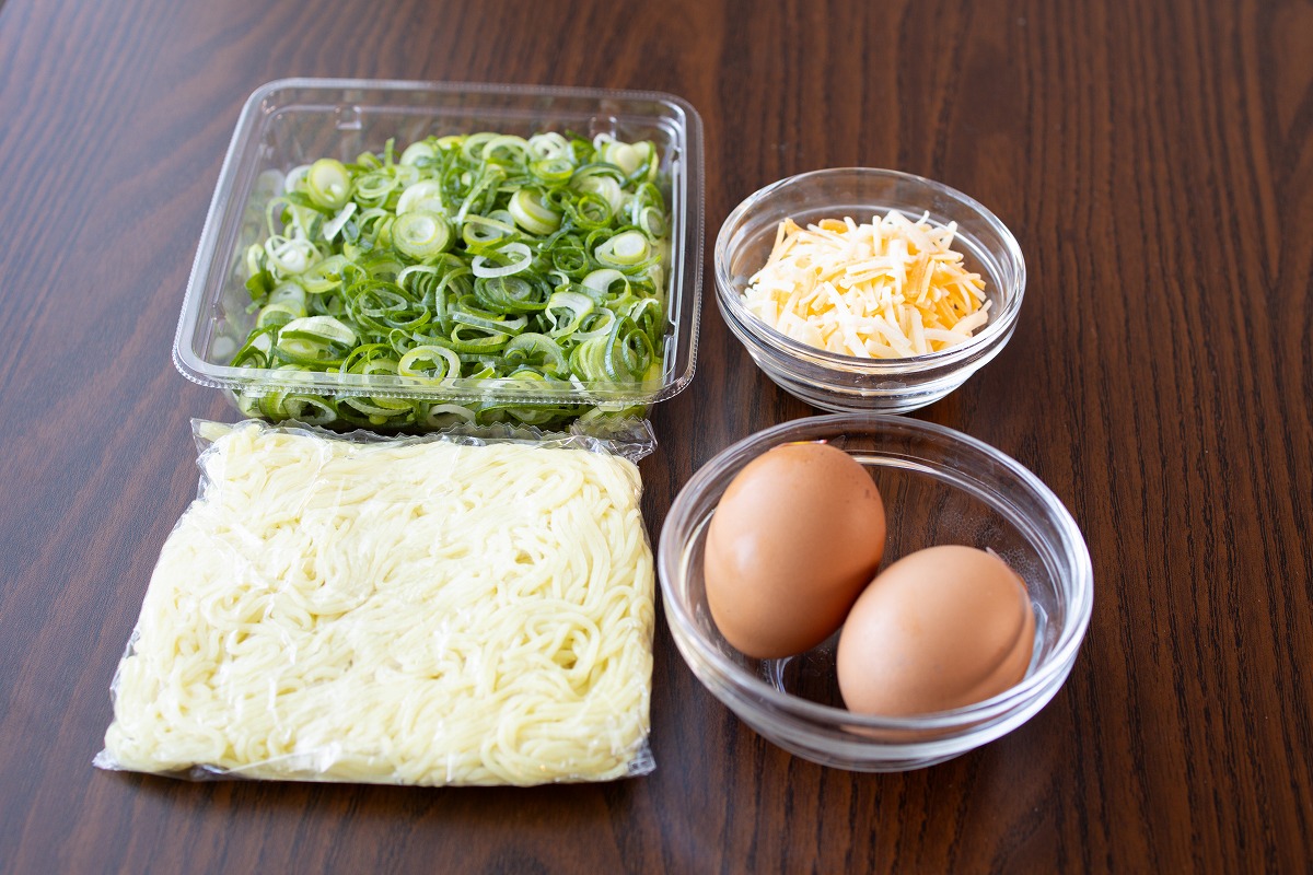 1. 焼きそばは袋を少し開け、電子レンジ(600W)で1分加熱したらボウルに移し、卵・チーズ・青ネギを入れてよく混ぜる。