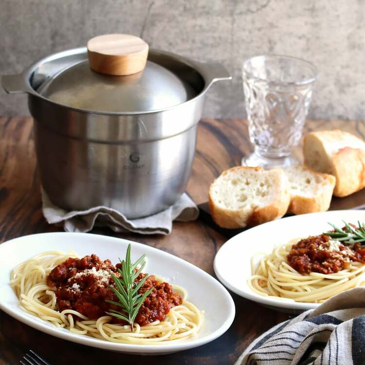 @mayu_kokonさんは、「マルチポット」で自家製ミートソースとパスタを調理。焦げ付きにくいから炒め物にも煮込みにも安心して使えるのだとか。深さのある形状で、パスタも茹でやすいそうですよ。