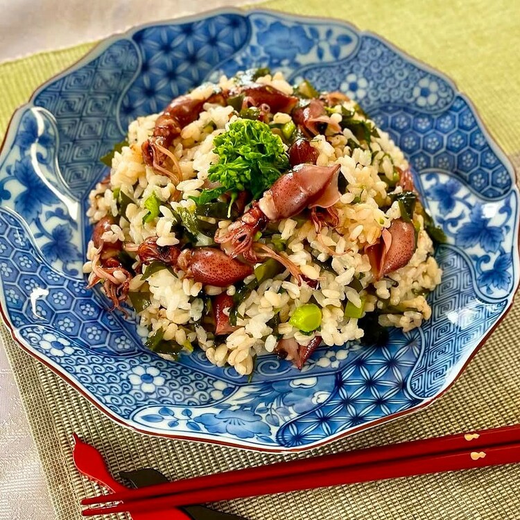 生わかめ、ほたるいか、菜の花という、春の味覚がギュッと詰まった「混ぜごはん」。炒めたあとに温かいごはんに混ぜるだけだから、とっても手軽に作れます。