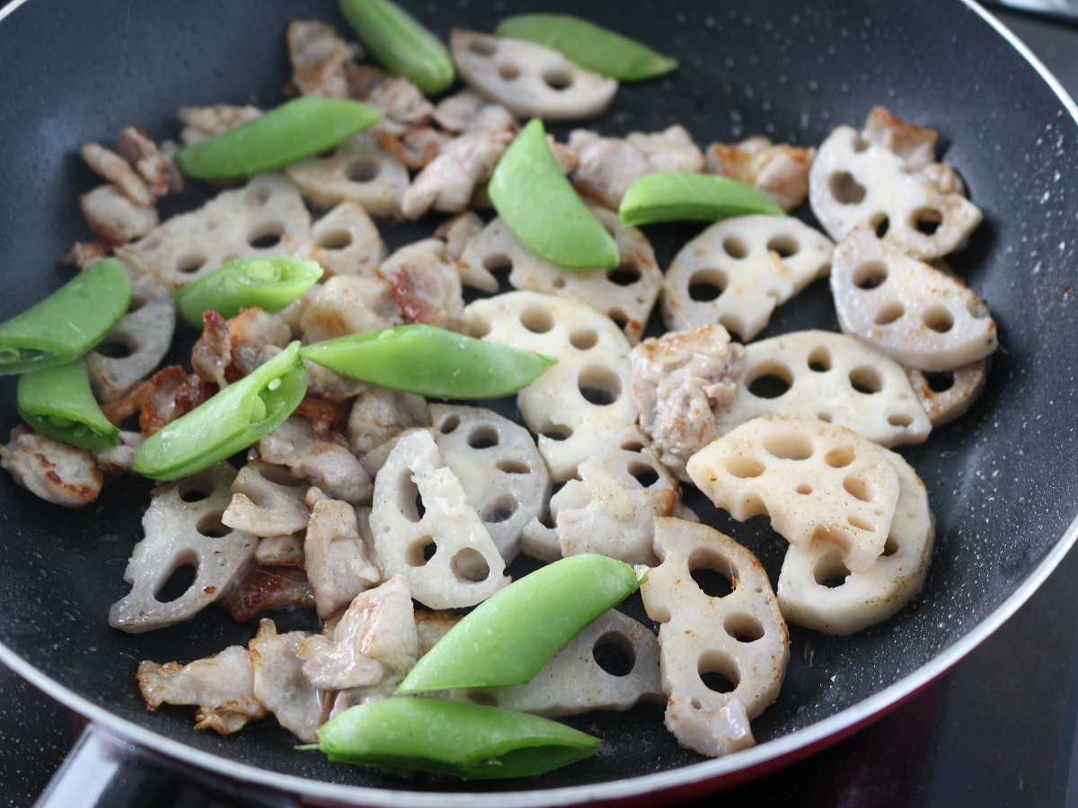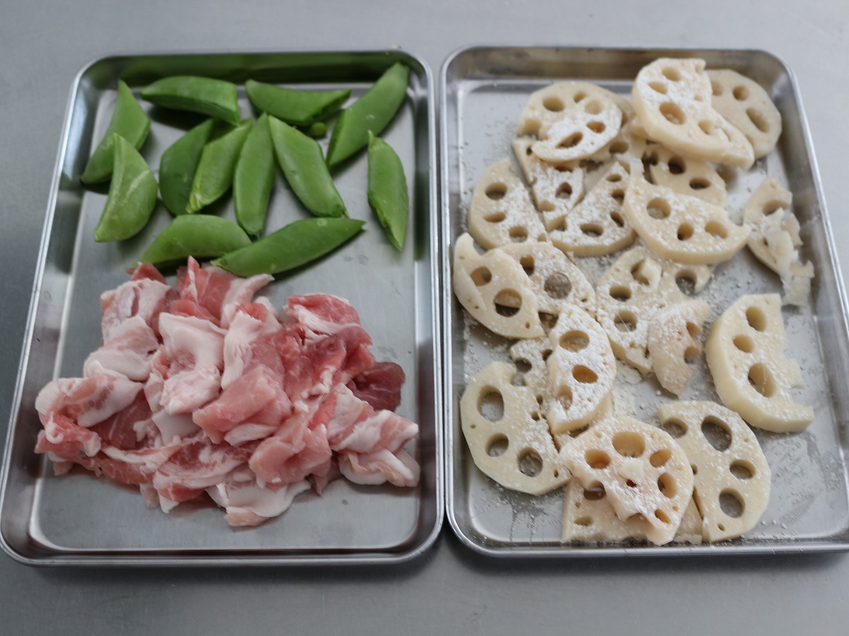 1. れんこんは5mm程度の半月切りにし小麦粉をまぶす。スナップエンドウは筋を取り半分に、豚肉は食べやすい大きさに切る。