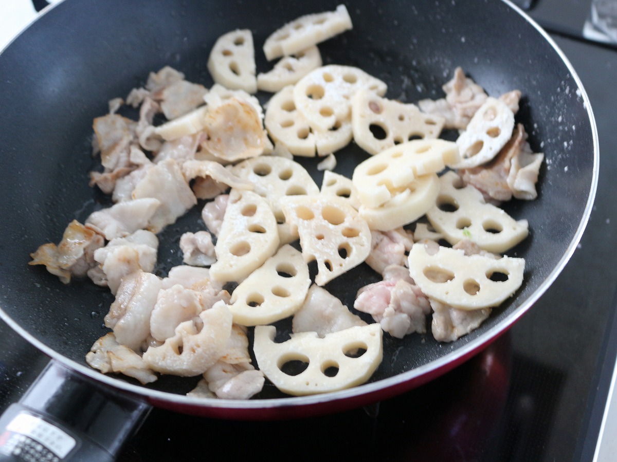 2. フライパンにサラダ油を熱し、豚肉とれんこんを入れ焼き目をつけながら炒める。