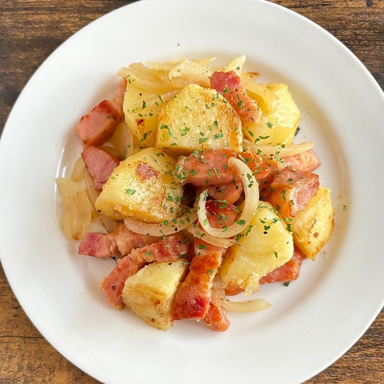 新じゃがのホクホク感とベーコンの旨みが相性抜群のジャーマンポテト。じゃがいもは先にレンジ加熱することで、炒め時間を短縮できます。新じゃがなら皮付きのまま調理できるので、特有の香ばしさを楽しめますよ♪