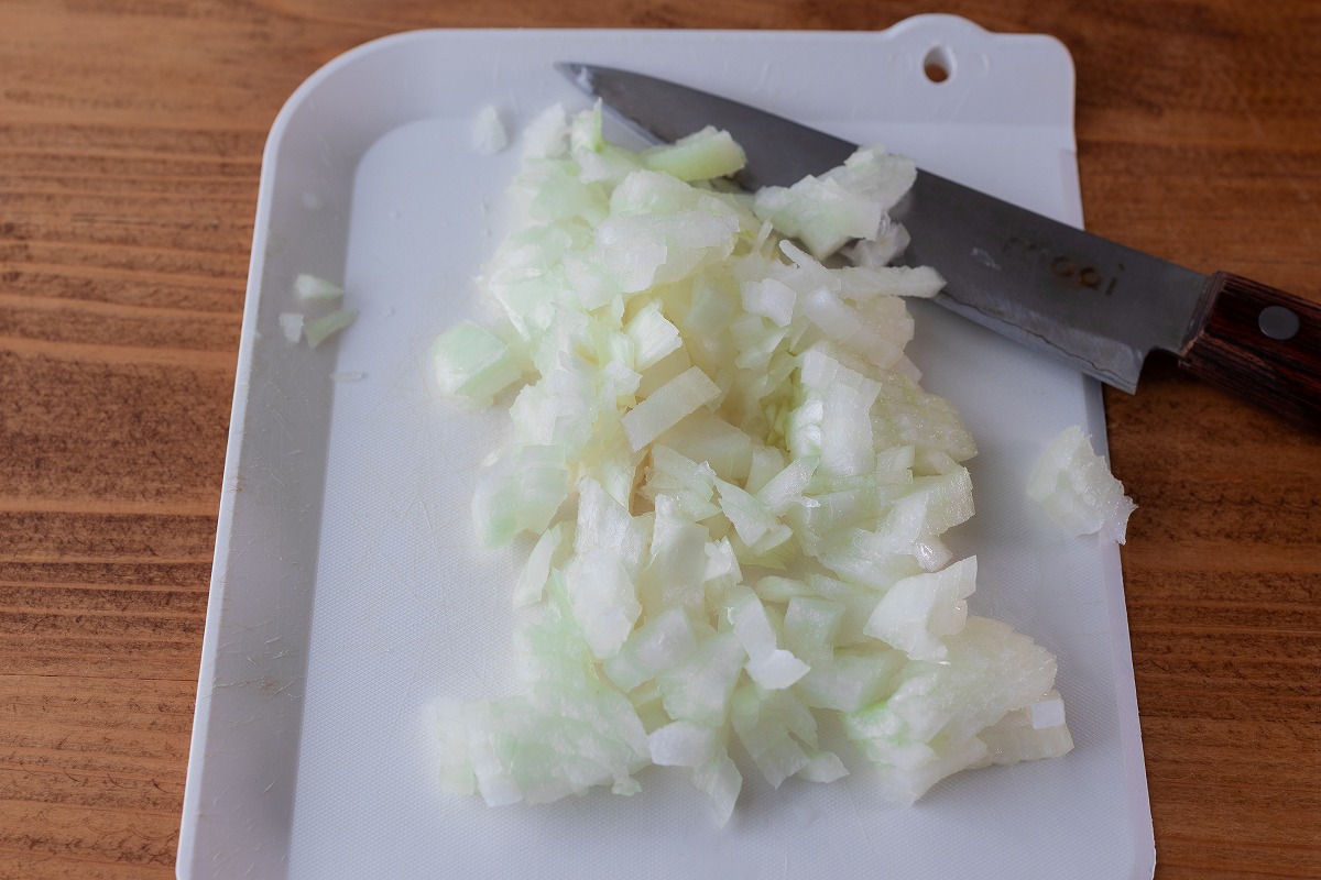 1. 玉ねぎはみじん切りにする。トマトはヘタ側を切り落とす。