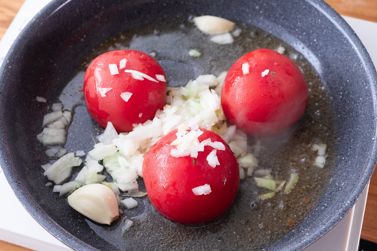 2. フライパンにオリーブオイルを中火で熱し、玉ねぎ・トマト・にんにくを入れて蓋をし、7分加熱する。