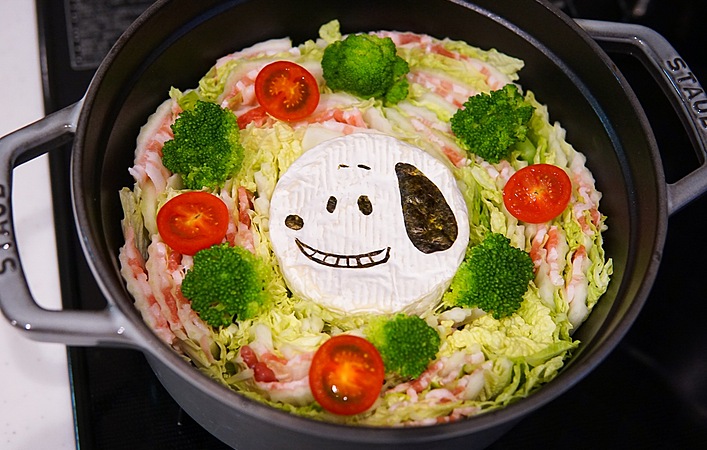 こちらは、スヌーピーでトマトカマンベールミルフィーユ鍋。