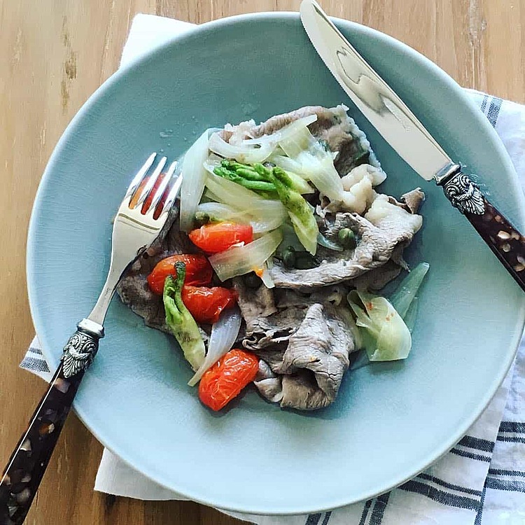 美容薬膳研究家@miyukichizuka さんの春の薬膳レシピ。牛肉のしゃぶしゃぶに、たらの芽と新玉ねぎ、トマトの蒸し煮が添えてあります。先生によると、「冬は寒さに備えてカラダも蓄えようとする季節ですが、春はカラダの中もリフレッシュして老廃物などいらないものを出していこうとする季節なので、食べ物でもその働きを補ってあげると効果的です。」とのこと。旬のパワーをいただいて、からだの中からリフレッシュしましょう!